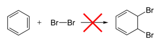Aromatic compounds (also known as "arenes") are much more stable and less reactive than alkenes. Unlike alkenes, aromatic compounds do not undergo electrophilic addition reactions because doing so would destroy the aromatic compounds's aromaticity (stability due to electron delocalisation in a ring).