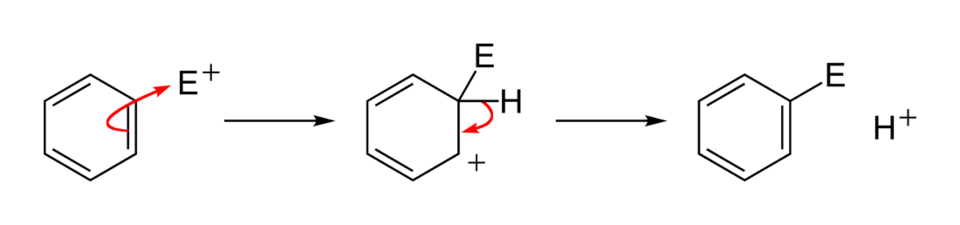 Once a suitably electrophilic species, E+, has been generated, it will react rapidly with benzene. A highly unstable intermediate (containing a tetrahedral carbon) is formed, which significantly disrupts the delocalisation of electrons in the ring. The intermediate immediately releases a proton in order to regain a fully aromatic ring and hence decrease its energy considerably.
