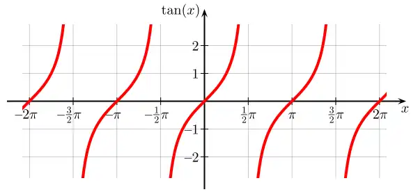 A tangent graph starts at , goes to infinity as it approaches , emerges from negative infinity after , then repeats this at . The tangent graph has a period of .