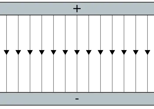 We can represent electric field using field lines. These go from positive charge to negative charge. They are more closely packed together when the electric field is stronger. In a uniform field, they look like the following: