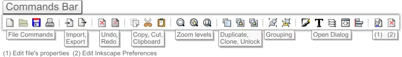 The Commands bar has buttons of frequently used edits such as file options, zoom levels, undo, copy, group, etc. Related edits are grouped along the bar and are separated by a vertical line |. A great example of this is the grouping of the highly used Zoom levels.