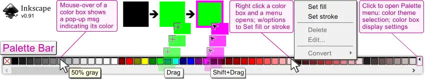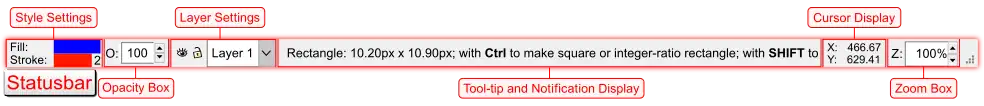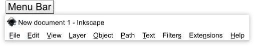 ne of Inkscape's main priorities is ease of use. This is visible on the Main Window as every bar's button (icon), numeric value and unit of measure boxes will produce tooltip (help) messages. The Menu bar is title, not button, based so when using these titled edits Inkscape still provides updated assistance. For a quick example, click the Menu's bar ‣File option, then mouseover 🖰 one of the ‣File options and there will be two feedback features. (1) The mouseover of one of the drop down menu items will highlight (background color) the item. (2) The Statusbar (bottom center) will provide an updated Notificaton message describing the highlighted Menu bar item.[1]