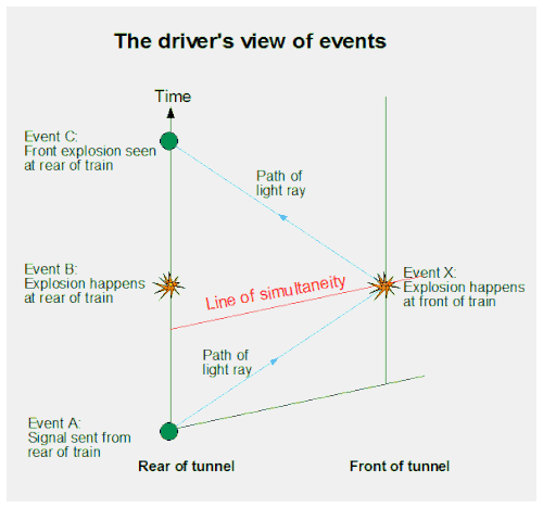 To the engine driver, it seems as if space and time are no longer at right angles and the 'lines of simultaneity' are tilted forward at an angle. The signal seems to reach the front of the train quite quickly and therefore to him, the explosion at the front seems to occur before the explosion at the back.