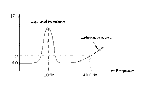 A phenomena of electrical resonance is observable around the frequency of 100 Hz. Besides, the inductance of the coil makes the impedance increase from the frequency of 400 Hz. So the range of frequency where the loudspeaker is used is 100 – 4000 Hz
