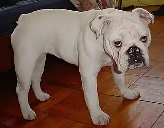 Description: The bulldog is a relatively small but stocky breed, with a compact body and short, sturdy limbs. Its shape results in a waddle-like gait. Bulldogs are known for their short muzzles and the saggy skin on their faces, creating the apparent "frown" that has become a trademark of the breed. Bulldogs come in a variety of colors and ideally have a smooth, short coat.