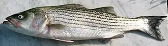 Description: The striped bass is a typical member of the Moronidae family in shape, having a streamlined, silvery body marked with longitudinal dark stripes running from behind the gills to the base of the tail. Maximum size is 200 cm (6.6 ft) and maximum scientifically recorded weight 57 kg (125 US pounds). Striped bass are believed to live for up to 30 years.