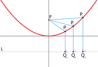 A parabola is the set of points that is the same distance away from a single point called the focus and a line called the directrix. The distance to the line is taken as the perpendicular distance.