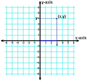 The axes and plane field extend out as close to infinity (positive and negative) as is necessary for any analysis. In practice graphs are abbreviated to areas of examination. In our example the generic point x,y is assigned to number values (x = 3, y =4) by plotting it at point 3,4. A line and a dotted line show that this position is located by starting at (0,0), moving 3 units in the positive x direction (right), and moving 4 units in the positive y direction (upwards).