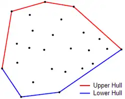 An upper hull is the part of the convex hull, which is visible from the above. It runs from its rightmost point to the leftmost point in counterclockwise order. Lower hull is the remaining part of the convex hull.