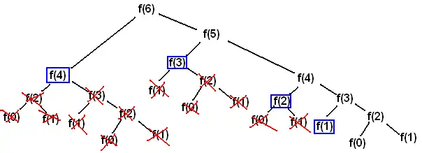 The values in the blue boxes are values that already have been calculated and the calls can thus be skipped. It is thus a lot faster than the straight-forward recursive algorithm. Since every value less than n is calculated once, and only once, the first time you execute it, the asymptotic running time is . Any other calls to it will take since the values have been precalculated (assuming each subsequent call's argument is less than n).