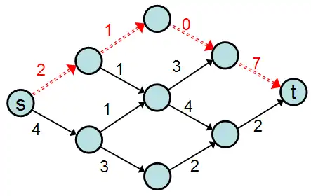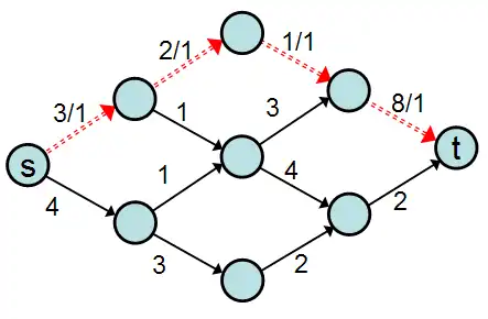 • This allows finding a reverse path from the target node once reached, to the start node. Once a path is found, the edges are examined to find the edge with the minimum remaining capacity, and this becomes the flow that will result along this path , and this quantity is removed from the remaining capacity of each edge along the path. At the "bottleneck" edge with the minimum remaining capacity, no more flow will be possible, in the forward direction, but still possible in the backward direction.