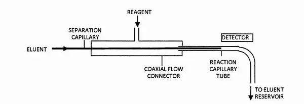 In contrast, an on-column coaxial flow interface has proved to be effective for a large number of applications.[2] Figure D11.1 shows the detector is located at the capillary outlet tip, so detection is “on-column”. The ground electrode is located in the effluent reservoir so that detection takes place within the high voltage zone. The separation capillary outlet is inserted coaxially into the reaction tube, giving rise to minimum turbulence and reproducible mixing.