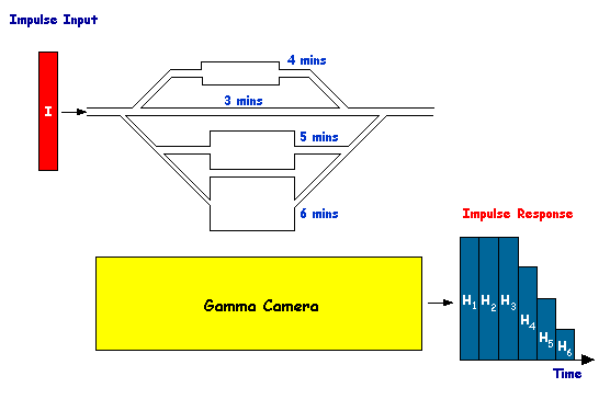 • The impulse response, H, in the first three minutes following the impulse injection will be equal to 1, because all of the input quantity of the tracer remains in the field of view of the gamma camera.