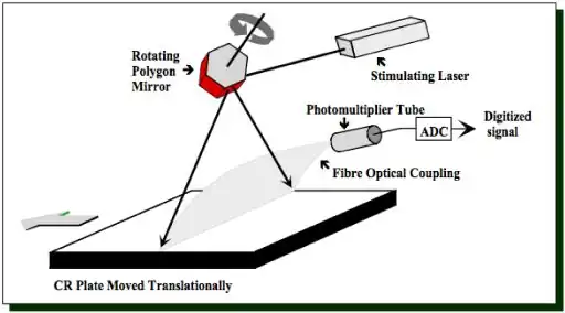 - The figure illustrates one mechanism used to scan the imaging plate where a narrow laser beam strikes a rotating mirror causing it to scan a single line across the plate. The plate is then moved so that the scanning laser beam can read the next line of the latent image information.