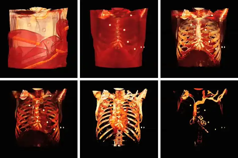 The outcome of this form of processing is the generation of an image which includes visual depth cues on the basis that similar voxel values will be displayed with a similar transparency and those closest to the reference slice having a stronger contribution than those from more distal slices. Further, note that all voxel values in each line contribute to the rendered image, in contrast to the limited number of voxels that contribute to a MIP or a MinIP image. A 3D effect results from volume rendering, as illustrated in the images above.