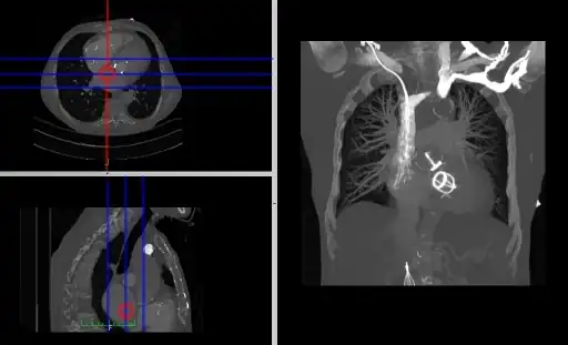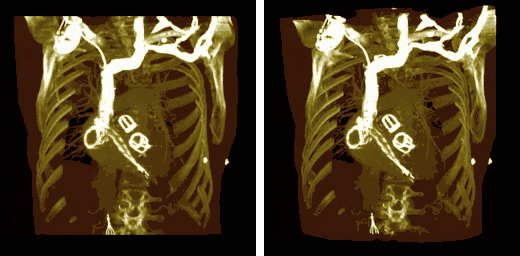 Note that the volume rendering can be contrast enhanced so as to threshold, for instance, through the voxel values to eliminate low attenuating surfaces, as illustrated in the following figure:
