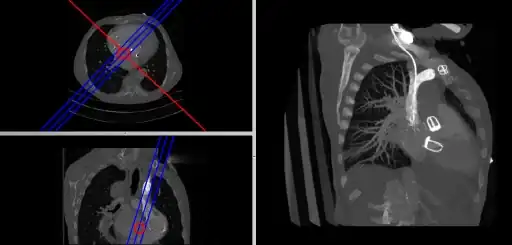 - Here the plane can be defined in, say, the axial images (red line, top left) and a maximum intensity projection (the limits used are highlighted by the blue lines), for example, can be displayed for the reconstructed plane (right). This technique is useful when attempting to generate perspectives in cases where the visualization of three-dimensional structures is complicated by overlapping anatomical detail.