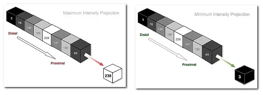 The first two images in the second row show the result of what are called a Maximum Intensity Projection (MIP) and a Minimum Intensity Projection (MinIP), respectively. A MIP evaluates each voxel along each line of voxels through the volume to determine the maximum voxel value and forms an image using the values so determined for each line. A MinIP uses the minimum voxel values, as illustrated in the following figure: