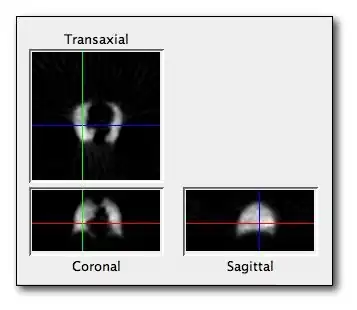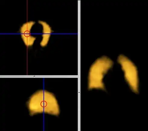 Since the ventilation tracer in this case was administered using a aerosol, we can assume for simplicity that its biodistribution is reasonably identical in the two scans. Further, since the scans were acquired about 15 minutes apart using the 99mTc radioisotope, we can assume a negligible effect from radioactive decay. We can simply therefore subtract the ventilation stack from the perfusion stack, on the basis of these assumptions, to isolate what we'll call the "pure perfusion" scan.