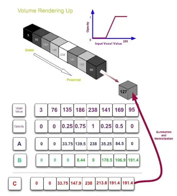 The bottom half of the figure shows the steps involved in calculating the volume rendered value of the composited voxel. Voxel values are shown on the top row with opacity values, derived from a crude opacity table, for each voxel shown on the second row. The third, fourth and fifth rows detail the values of A, B and C, calculated using our volume rendering equation above. The final voxel value is obtained by summing the bottom row, and normalizing the result to, say, a 256 level grey scale.