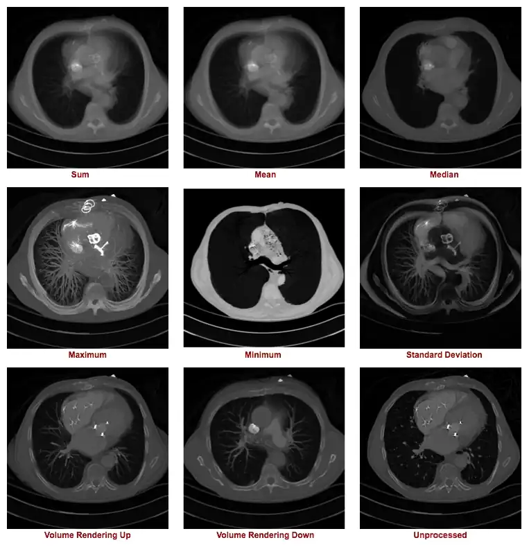 The type of axial projection method appropriate to an individual patient study is dependent on the anatomical and/or functional information of relevance to the diagnostic process. Let's take the case of imaging contrast-filled blood vessels, for example, in our nine example images above. Note that a MIP can be used to give a visually-stunning impression of the vessel bed in the patient's lungs. There's little depth information in this projection, however, so that overlapping and underlying vessels can obscure lesions that might be present in blood vessels of interest. The application of this form of axial projection to angiography is therefore limited to studies where vessel overlap isn't an issue. The inclusion of voxel transparency and depth weighting in volume rendered images addresses this limitation of MIP processing.