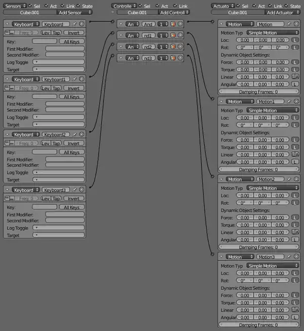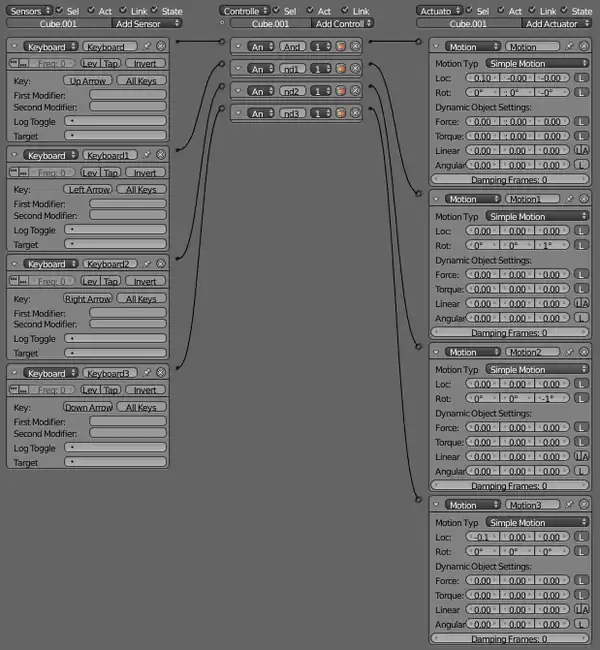 Okay, time to get to work. Make sure you are on the cube (or what ever you want your hero to be). Add four keyboard sensors. Next, add four and controllers. Finally add four movement actuators.
