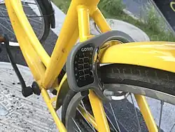 Figure 5. A ring lock. It locks the rear wheel to the bicycle frame, but does not secure the bike to the stand. Bike rentals use these.