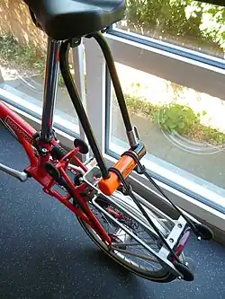 Figure 6. Shows a simple method of mounting a Brompton bicycle lock by sliding it through the seat rails and suspending it to the rear rack. A cheap alternative to expensive luggage.