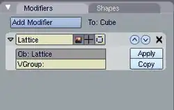 NOTE: In older versions of Blender, a lattice was applied using a parent method - select the mesh, then select the Lattice, then press  Ctrl + P  and choose "Lattice Deform". While this method is still available, it does not offer the full functionality of the newer Lattice Modifier. If you use the parent method, you will need to press the "Make Real" button in the modifiers palette to enable the modifier functionalities. Using the method, the Lattice becomes a parent and a modifier. As a parent, it will act on the mesh in Object Mode whereas a true modifier lattice only influences the mesh when altered in Edit Mode.