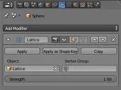 Lattice modifier interface in Blender 2.78. The modifier affects object Sphere. Effect is governed by lattice object named Lattice.