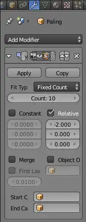 Look at the checkboxes: “Relative Offset” should be checked, “Constant Offset” and “Object Offset” should not be checked. Under “Relative Offset”, there are values for X, Y and Z; these are the distances between copies, relative to the dimensions of the object. Change the X value to something like -2 (the negative value causes the duplicated paling to appear on the other side, away from the gap we want to leave in front of the door). Now increase the number under the popup that says “Fixed Count”, and watch the line of duplicates lengthen until it reaches the point that you want to be the corner of the fence line—a count of about 12 did it for me.