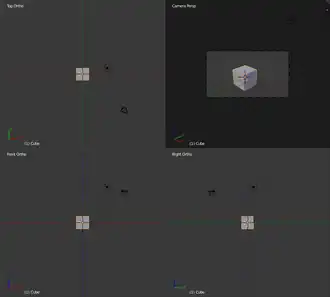 Start a new document ( CTRL + N ). Split the view into four views as at right, by pressing ALT + CTRL + Q . This gives you a standard set of views: top, front, side and camera, the first three orthographic and the last one in perspective. You can switch back to the single 3D view at any time by pressing ALT + CTRL + Q again.