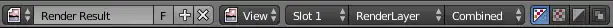 Here is what the variable part of the window header looks like when you choose the special “Render Result” entry in the image-selection menu. The next menu, showing the word “View”, serves no useful purpose in this case (it is only applicable to editable images, not the render result). Next to that is a Slot menu, allowing you to select from any of 8 numbered slots. Each slot can hold a separate Render Result image. This is handy for trying out different render settings (e.g. quality etc), and quickly flip between them for comparison. You can also use the keyboard shortcuts  1KEY  ..  8KEY  to switch slots. When you perform a render, the generated image is put into the slot you are currently viewing in the UV/Image Editor.