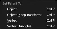• Object: set the parent of the rest of the selection to the active (last-selected) object, clearing any existing parent relationships the new-children-to-be may have had. Any objects that were previously parented are reset to their original transformations before that previous parenting.