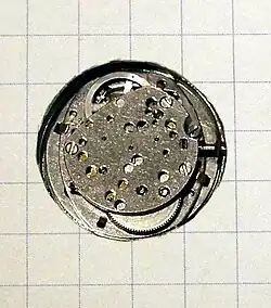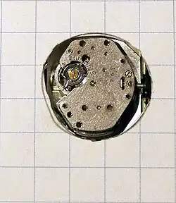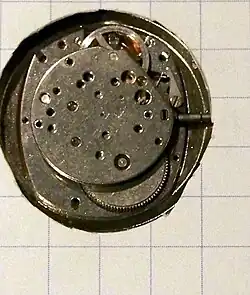 Base movement Model 24 has an oval-rectangular dial plate, and a mostly circular back plate, with a flat at 2:00. Balance is at 5:00. First used in 1963, continued with minor modifications until mechanical production ended.