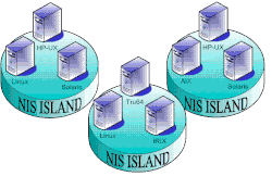 In an IT organization which administrate all kind of computer systems, following abstracted diagram shows the systems are segregated into varied sub-systems islands by NIS name services. Each NIS islands has its own set of accounts, netgroups and varied same software.
