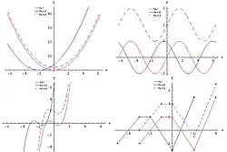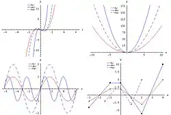 Translations and dilations can be either horizontal or vertical. Examples of both vertical and horizontal translations can be seen at right. The red graphs represent functions in their 'original' state, the solid blue graphs have been translated (shifted) horizontally, and the dashed graphs have been translated vertically.