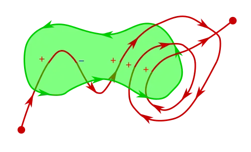A simple path (also called a simple curve) is an oriented continuous curve that extends from a starting point to an ending point . Intermediate points are indexed by and are denoted by . A simple path should be continuous (no breaks), and may intersect or retrace itself. A "multi-path" is a set of simple-path/weight pairs: where is the weight that is assigned to path . Given two path/weight pairs and that cover the same path , the weights add up to get which replaces and . Any pair is removed. In addition given two path/weight pairs and with the same weight and , then and can be linked end-to-end to get the pair which replaces and . Assigning a path a negative weight effectively reverses its orientation: if denotes path with the opposite orientation, then is equivalent to . can consist of infinitely many paths, and each path may have an infinitesimal weight.