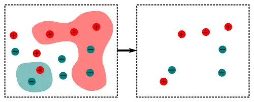 The multi-point (a collection of weighted points) on the left can be denoted by the scalar field in the middle. On the right is a more canonical multi-point with the same scalar field, where nearby points of opposite sign have cancelled out.