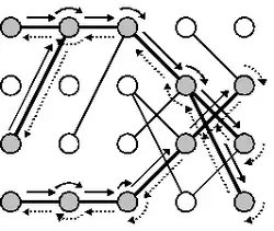 This algorithm traces paths through the preimage diagram. It starts at the first node at the left that is not masked by left boundary conditions. Depending on the position index value and whether there are links to the right there are four options: