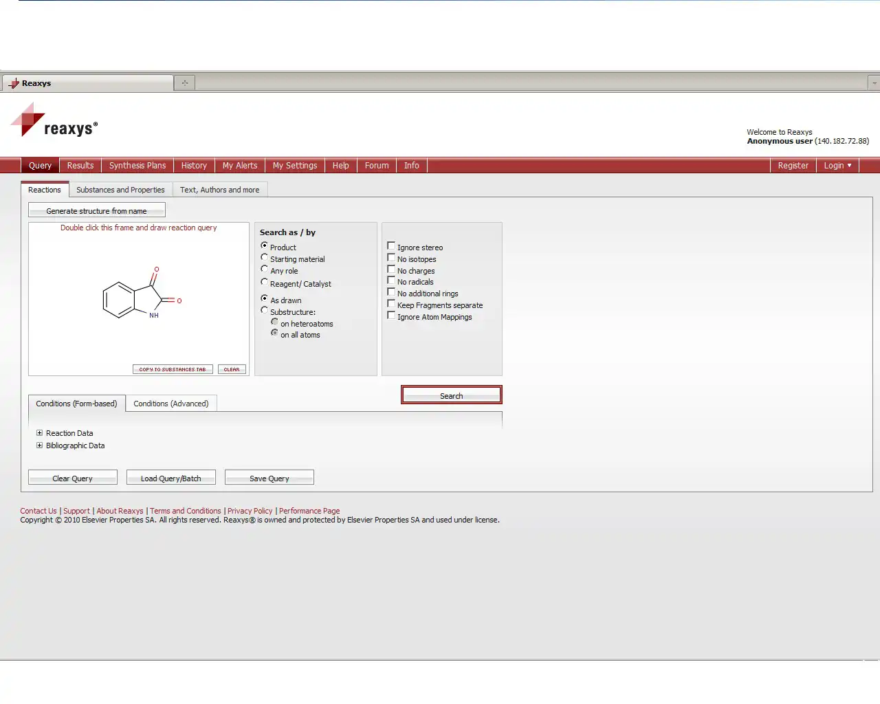Reaxys Structure Editing Screen with Isatin Molecule (above) and Two of the Search Results (below)