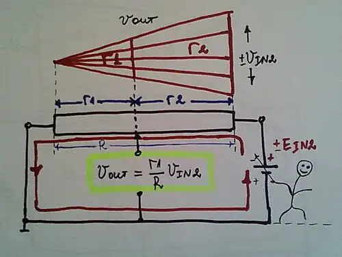 In this lab exercise we tried to "invent" new analog devices using our knowledges for the famous Ohm's experiment. In order to see the graphics of our "new" devices, we used Microlab - PC Apple2 connected to 4 DACs and 4 ADCs. We made a couple of experiments and these are the schemes we were analysing. First the voltage source is connected only to the one end of the resistor and we measure the potential along the resistive layer(1st picture). Thus we make a linear transference-to-voltage converter.