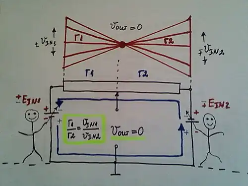 If we have voltages with different polarity and VIN1 and VIN2 are selected so that VOUT=0 (point known as "virtual ground") we have a comparing device,like in the scheme in the third picture:VIN2/VIN1 = -(r2/r1).To keep Vout = 0 we can use operational amplifier(down).Here I1.R1=(VIN/R1).R2 or VOUT/VIN=-R2/R1.