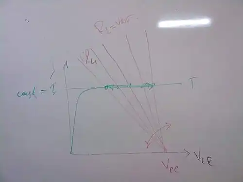 Let's now begin reasoning what happens when we begin varying RL. If we decrease it, the source curve rises and v.v., if we increase the resistance, the source curve lies down. And, as they usually say in classical electronics courses, since the transistor's output characteristic is almost horizontal the operating point moves almost horizontally along it; the current variations are insignificant. This explanation works of a sort but we would like to know how the transistor actually does this magic; how its output characteristic is obtained. But nobody answers these questions...
