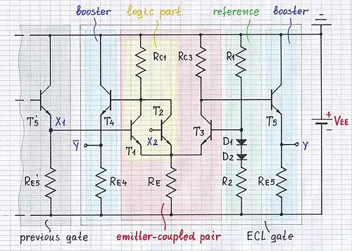 A typical ECL circuit diagram based on Motorola's MECL 10k.