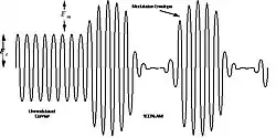 Notice that the amplitude of the high frequency carrier takes on the shape of the lower frequency modulation signal, forming what is called a modulation envelope.