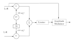 The basic idea behind the C-Quam modulator is actually quite simple. The output stage is an ordinary AM modulator however; the carrier signal has been replaced by an amplitude limited vector modulator. Therefore, the limiter output is really a phase-modulated signal.