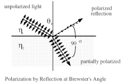 The relationship between angle of incidence and amount of reflection is very complex. At normal incidence, a reflecting surface reflects all components equally well. However, at other angles, objects prefer to reflect light having the electric field component perpendicular to the plane of incidence. At the extreme case, Brewster’s angle, only perpendicular components are reflected, and complete polarization occurs. Brewster’s angle is defined by: