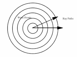 If we examine light at the macroscopic level, we observe that waves radiate spherically from their source. This is readily observable with incoherent sources and less pronounced with coherent sources. At a large distance, the wavefront flattens out into a plane wave. A ray path shows the direction that the wave or photon is traveling. In the case of a point source, this might resemble: