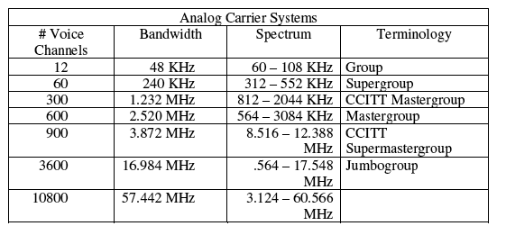 The analog voice channels are pre-grouped into threes and heterodyned on carriers at 12, 16, and 20 kHz. The resulting upper sidebands of four such pregroups are then heterodyned on carriers at 84, 96, 108, and 120 kHz to form a 12-channel group.
